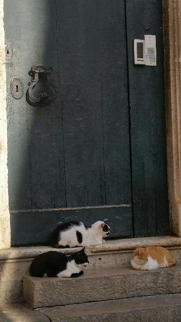 Morgens in die Altstadt. Wir mögen das! Unseren Weg führt uns durch eines der wenigen "Löcher" in der Mauer (=Buža) nach draußen direkt ans Meer. Und das ist heute so ungestüm, dass Christof eine nicht ganz ungefährliche ordentliche Dusche auf den Klippen abbekommt. Wir bleiben eine Zeitlang und beobachten das riskante Treiben der Touris, ein spektakuläres Foto mit spritzendem Wasser zu schiessen. DAS haben wir schon hinter uns! Ein paar Ober-Idioten wollen sich direkt an die Kante setzen und werden schneller vertrieben als sie denken können... Coole Musik von Blues Brothers bis ZZ-Top und ein cooles Bierchen machen die Aussicht und die lauten Wellen zum Event.